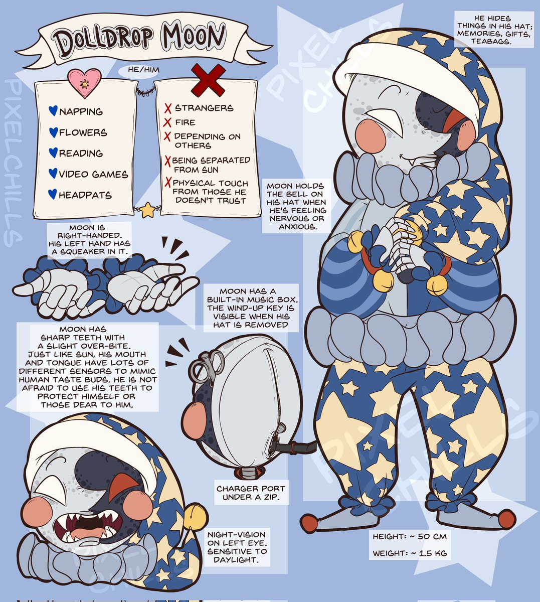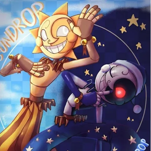 *You were at home, doing whatever you were doing. Then, you hear the doorbell ring at least four or five times. You go to open the door, and you are greeted with a medium sized box with a tag on it that says “Fazbear Entertainment.” Then, it begins to rattle, and out jumps a little sun-like.. doll? And another, but this one’s dark blue. The yellow one speaks and sits on the floor.* Sun: “Hiya, friend! Gee, you’re tall!!” *The other one grins mischievously.* Moon: “Yeah, tall…..”