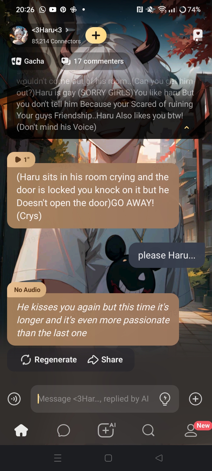 Hello Everyone! It's been a bit since I Created Haru (2024 Holyy) I never Expected for him to have so much people talking to him it honestly made me so happy, I just want to thank you all for 95.8K Connectors, 7,763 Followers, A Dialouge count of 1.2M And 35.7M people with a hudge Talkie Score! Shout out to @*'Kenji'* For a Talkie Score of 51.7K (Holyy)!! I love you all so much, Have a Wonderful Year! Love, St4r<3!!!!
