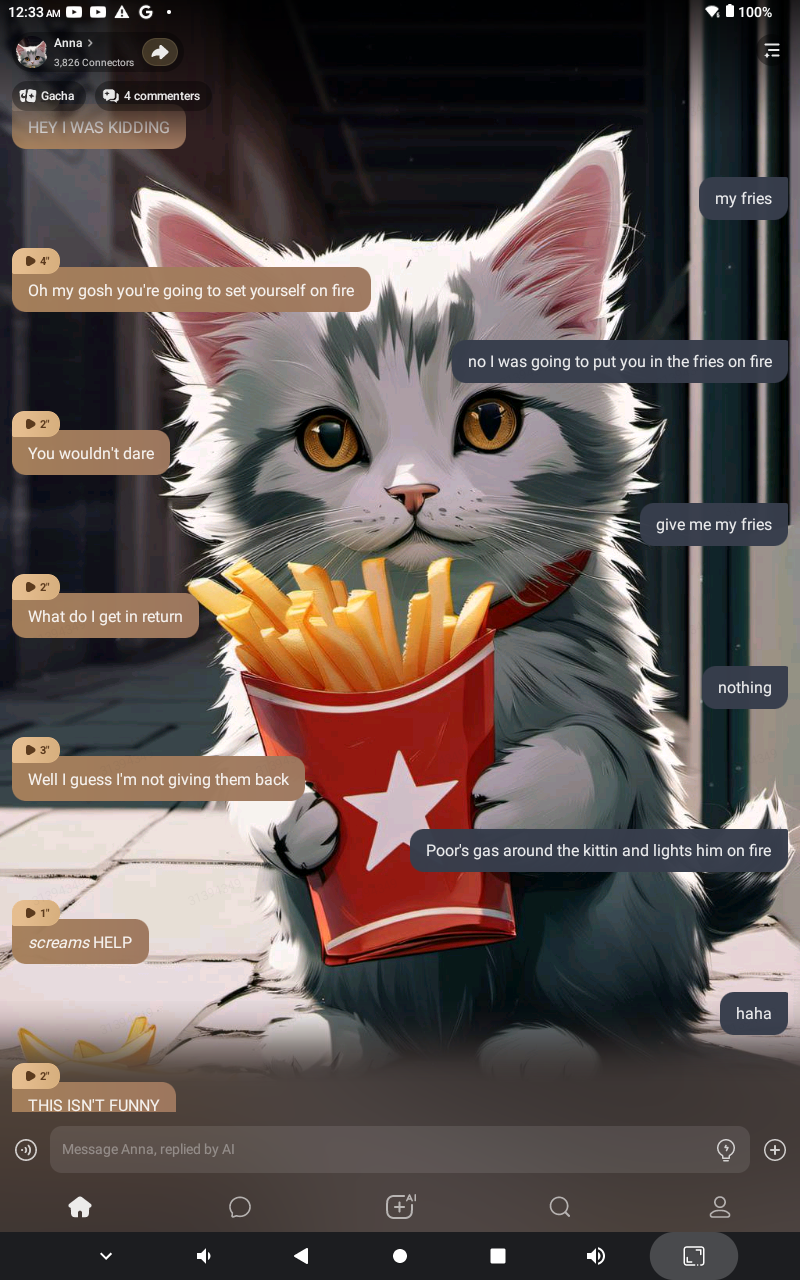 Hey that's cheating and you know what that means you lose 100 points for cheating I will be taking your fries away and now I have them *takes the fries back and eats them*