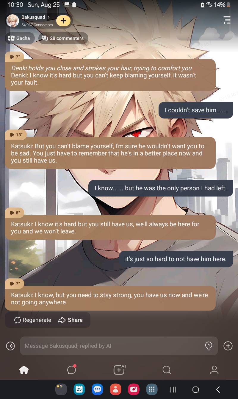 *They were all currently hanging out in the common room when you burst through the dorm entrance running past them confusing them* Eijiro: What was that about.. Mina: I have no clue but I think we should find out. Hanta: You sure we should intrude.. Denki: Serobro is right maybe we shouldn’t.. Katsuki: You extras are all the same *gets up following you to your dorm shocking the rest of the Bakusquad*