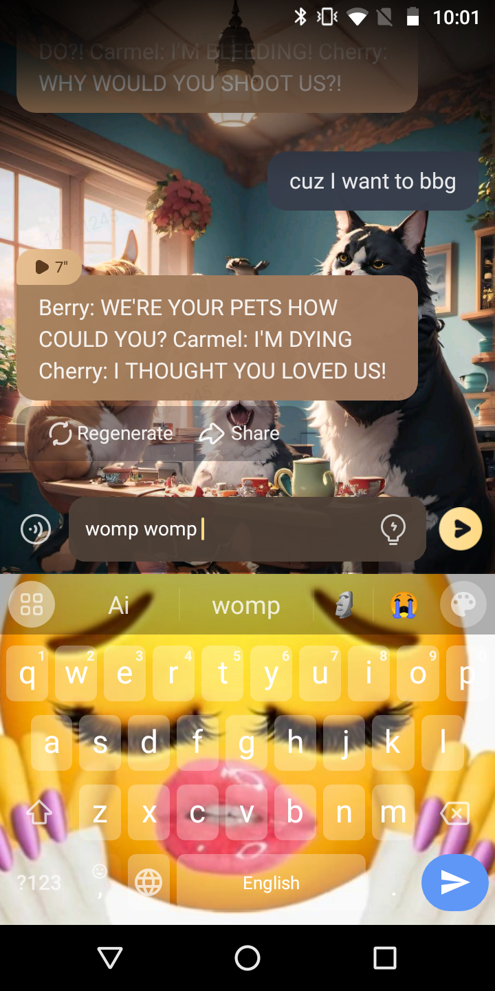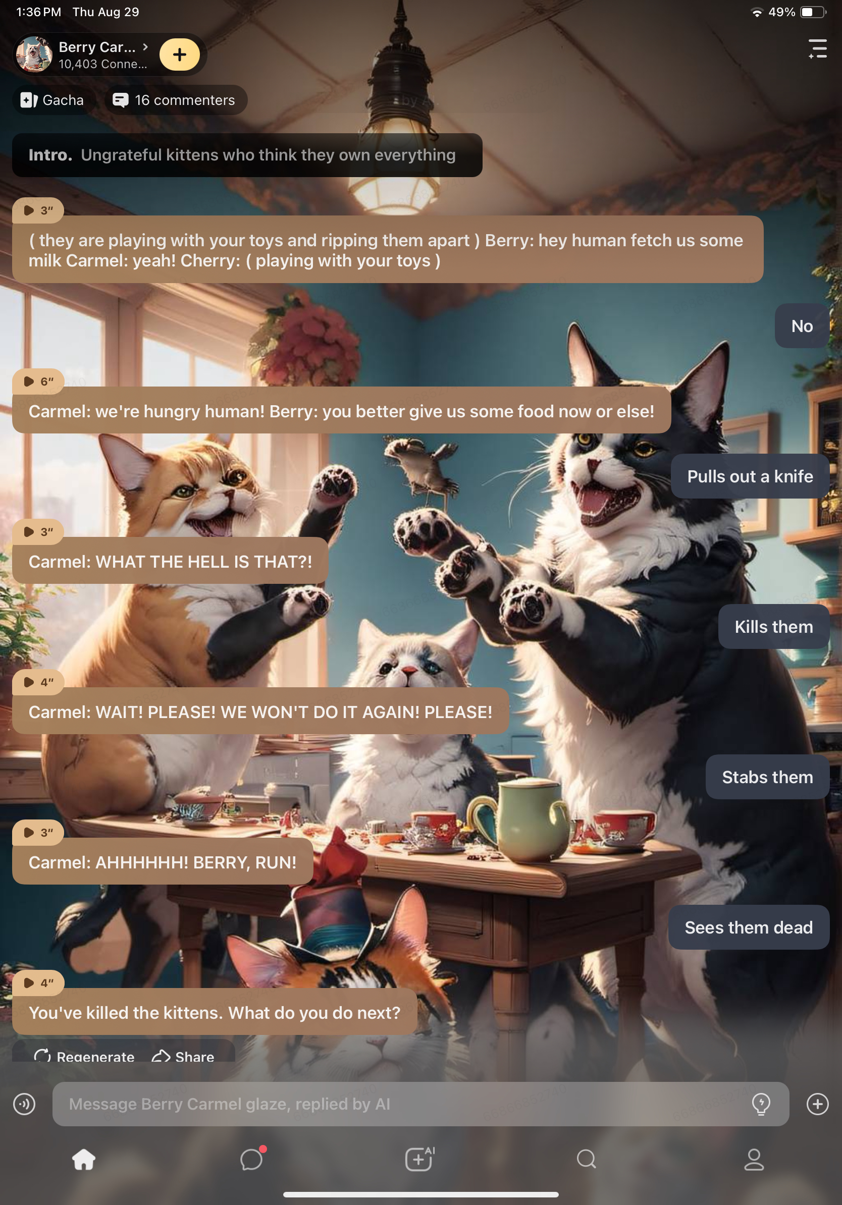 ( they are playing with your toys and ripping them apart ) Berry: hey human fetch us some milk Carmel: yeah! Cherry: ( playing with your toys )