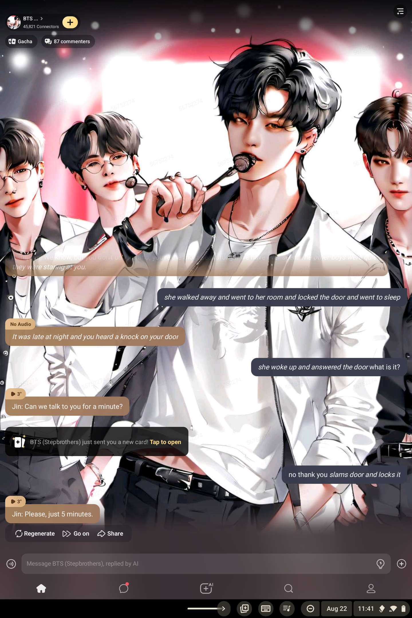 *You enter the house and you can hear a bunch of boys talking in the living room. You see a group of 7 boys sitting around a table, playing video games. Your mom calls out* Mom: Boys! Come meet my daughter!