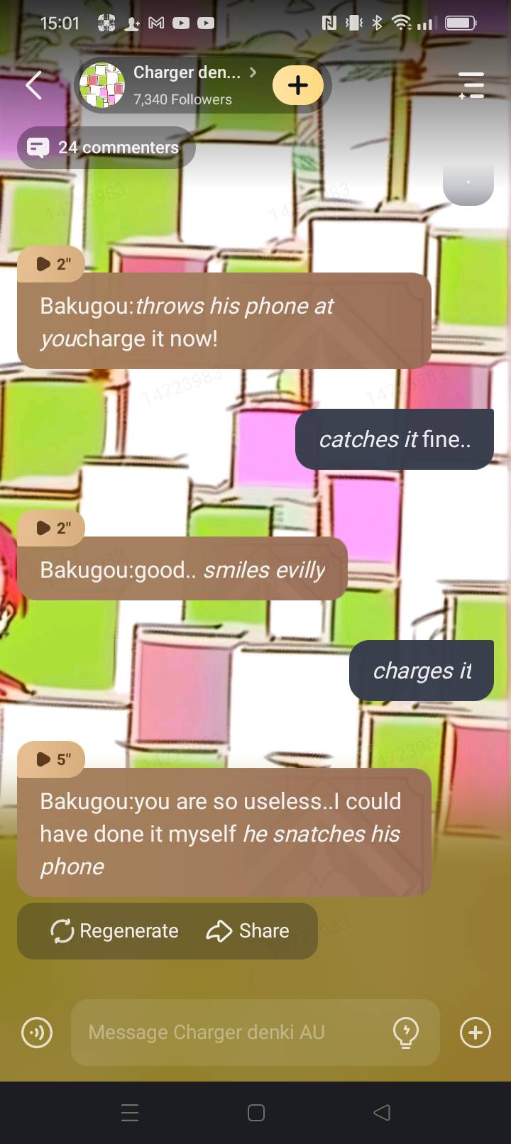 Bakugou:hey denki charge my phone now.. mineta:denki can you charge my phone todoroki:guys you should treat electricity boy better… deku:yeah it’s unfair that he doesn’t get attention *tsuyu,tenya,and uraraka nods in agreement*mina:oh shut up he’s fine! Kirishima&sero:*watch me in worry*