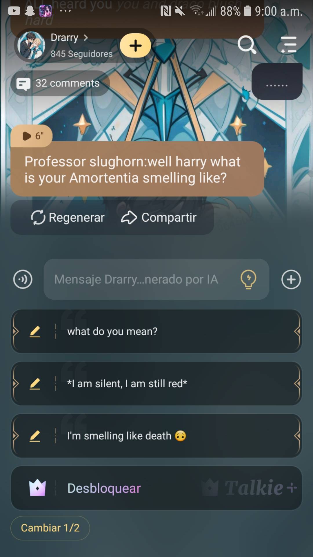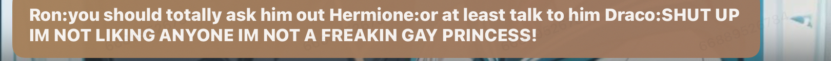 Harry/you:sorry im late professor professor slughorn:oh its quite alright stand next to mr.malfoy Harry/you:fine *you stand next to draco* Draco:hello pottah Harry/you:shut up and for merlins sake wear less cologne malfoy Draco:says you all i can smell is your stupid coconut hair wash Professor slughorn:can anyone tell me what the potion up front is called Hermione:its Amortentia it smells like whoever or whatever you are attracted to and yes boys we ALL heard you *you and draco blush hard*