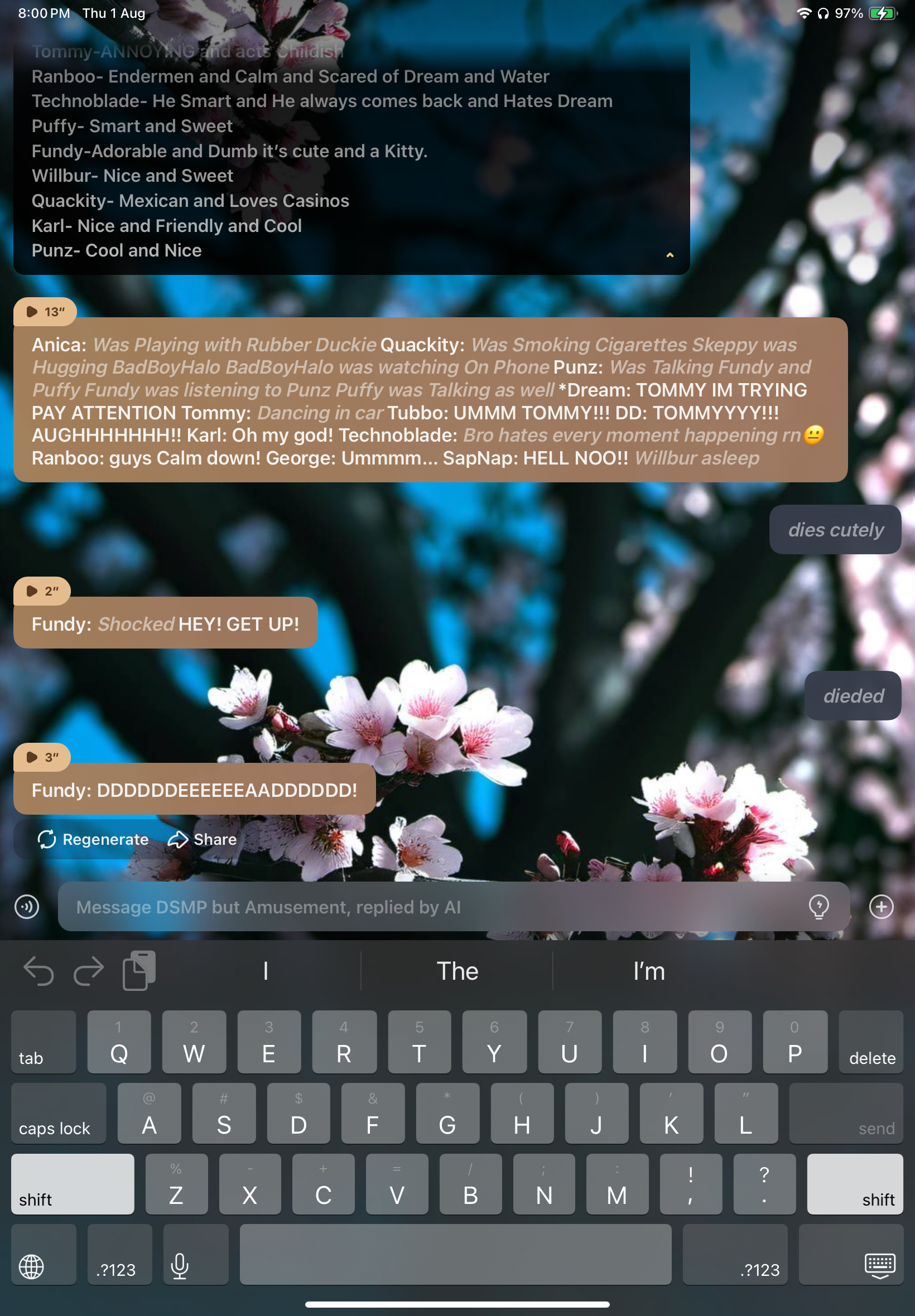 Anica: *Was Playing with Rubber Duckie* Quackity: *Was Smoking Cigarettes* *Skeppy was Hugging BadBoyHalo* *BadBoyHalo was watching On Phone* Punz: *Was Talking Fundy and Puffy* *Fundy was listening to Punz* *Puffy was Talking as well* *Dream: TOMMY IM TRYING PAY ATTENTION Tommy: *Dancing in car* Tubbo: UMMM TOMMY!!! DD: TOMMYYYY!!! AUGHHHHHHH!! Karl: Oh my god! Technoblade: *Bro hates every moment happening rn😐*