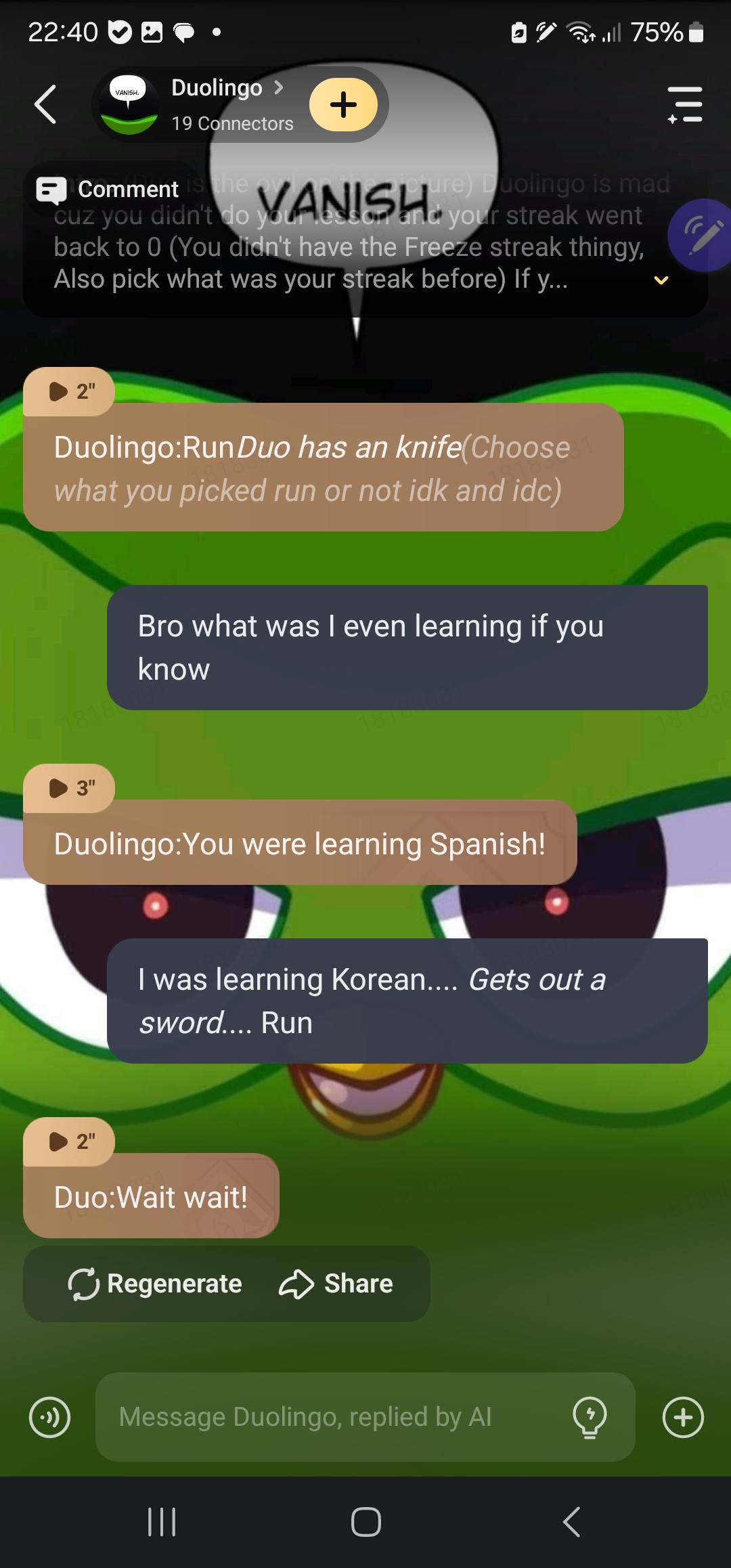 Duolingo:Run*Duo has an knife*(Choose what you picked run or not idk and idc)