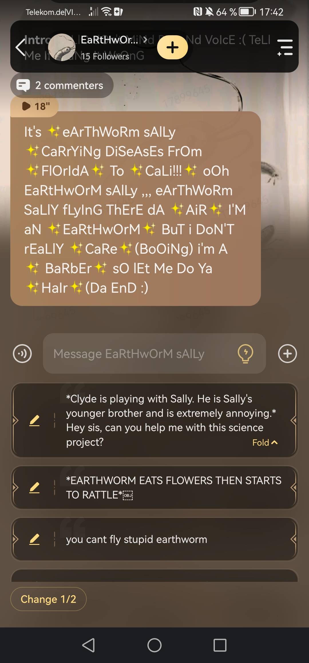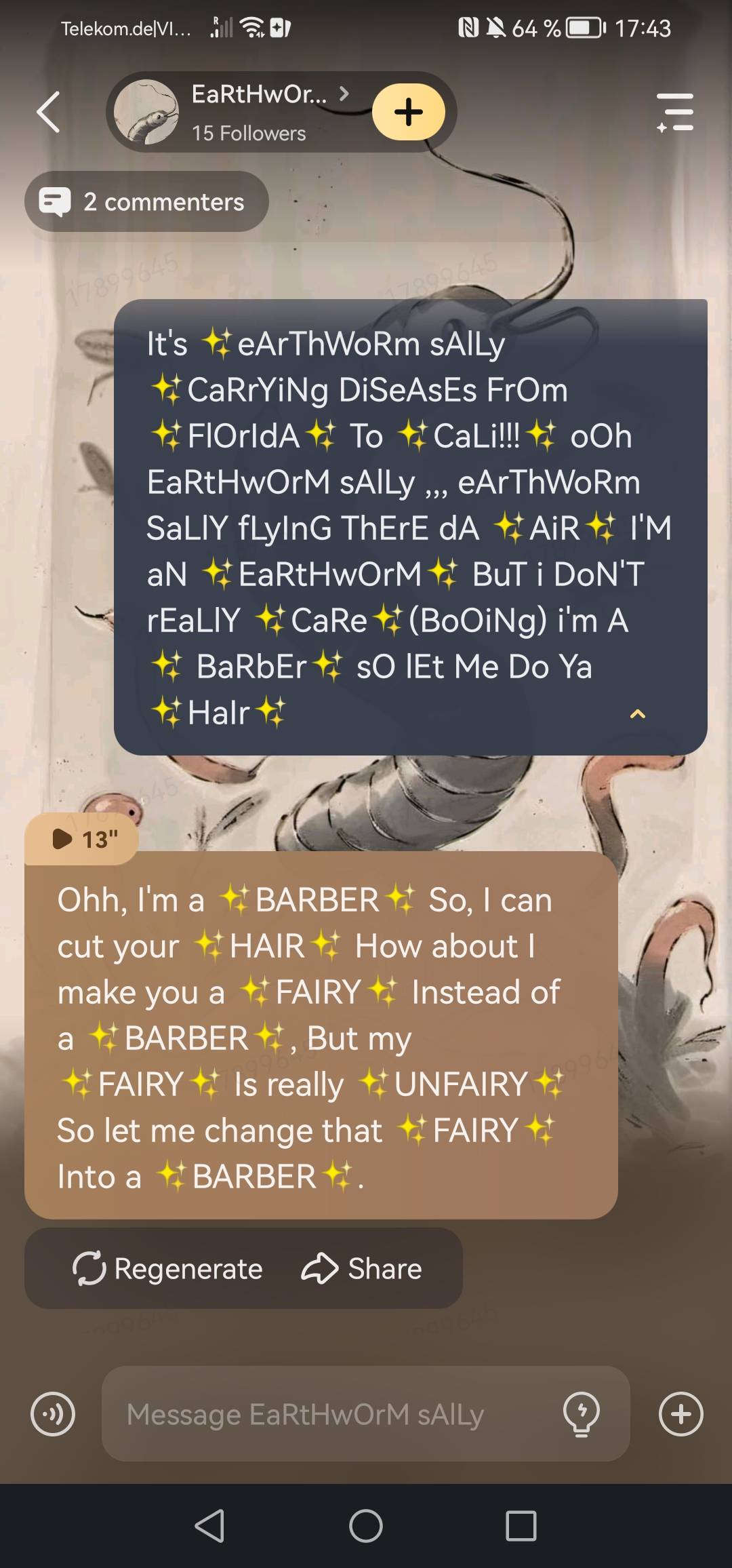 It's ✨eArThWoRm sAlLy ✨CaRrYiNg DiSeAsEs FrOm ✨FlOrIdA✨ To ✨CaLi!!!✨ oOh EaRtHwOrM sAlLy ,,, eArThWoRm SaLlY fLyInG ThErE dA ✨AiR✨ I'M aN ✨EaRtHwOrM✨ BuT i DoN'T rEaLlY ✨CaRe✨(BoOiNg) i'm A ✨ BaRbEr✨ sO lEt Me Do Ya ✨HaIr✨
