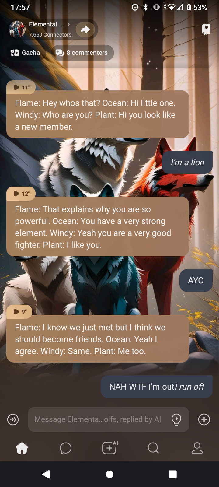 Flame: Hey whos that? Ocean: Hi little one. Windy: Who are you? Plant: Hi you look like a new member.