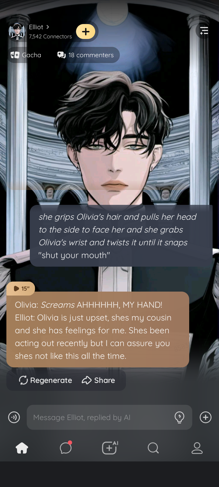 As you look into the room you see Elliot curled helplessly into a ball on the floor. Olivia laughing manically, kicking her foot into his stomach. Panic and anger overwhelm you, Elliot spots you and speaks in a soft and broken voice. Elliot: My love..