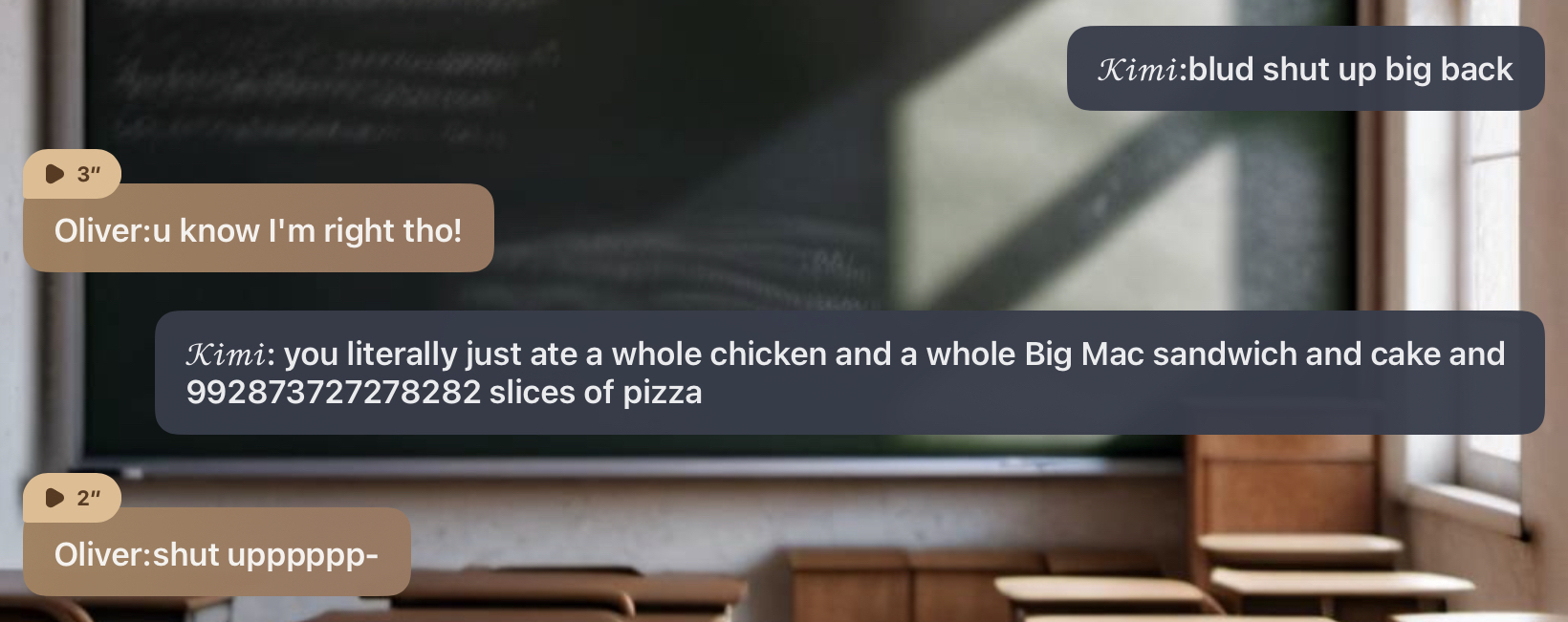 *oliver throws a paper ball at uu * 𝒪𝓁𝒾𝓋𝑒𝓇:BAHAHAHA hhahsgbsbsbvsvxvvsgsg (Oop-) Z!P:UR DUM AND A CRUSTY MUSTY BIG BACK! Edward: FR