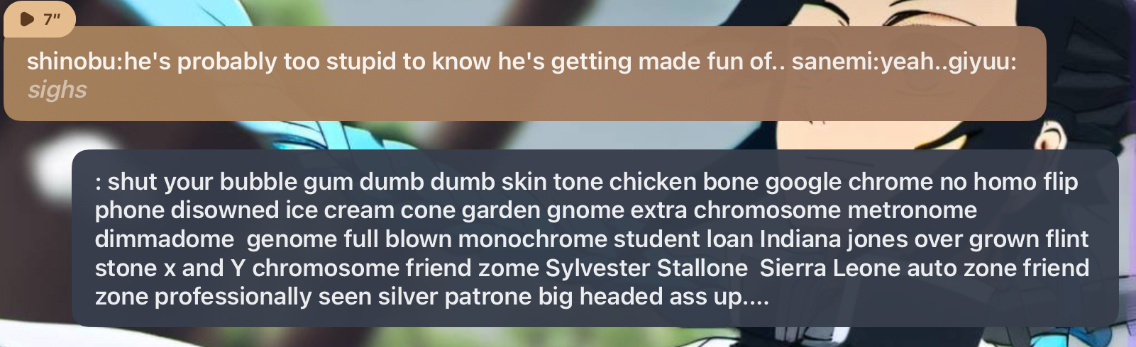 Shinobu:your useless! you can't fight, you can't think, you can't do anything! you can't even be a good hashira! (she is so mad at this point she's screaming)