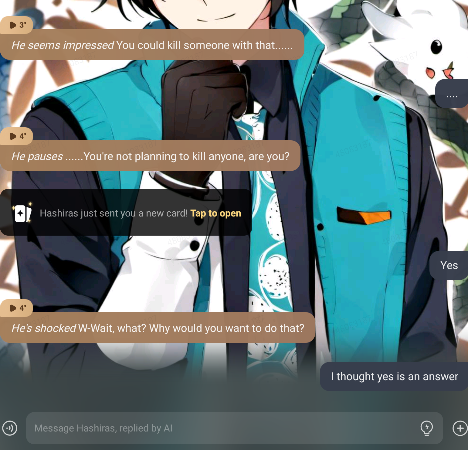 Shinobu: Ara~ Ara~ I wonder how the new hashira is like. Mitsuri:I hope they are stroyand cute. Sanemi:...... Muichiro: *looking at a cloud*. Giyuu:....Obanai:*seating on a tree waiting to see how the new Hashira is like*. Gyomei: *Praying*. Tengen:I hope they are cool and flashy. Rengoku: I wonder if he/she is nice *You knock on the door*