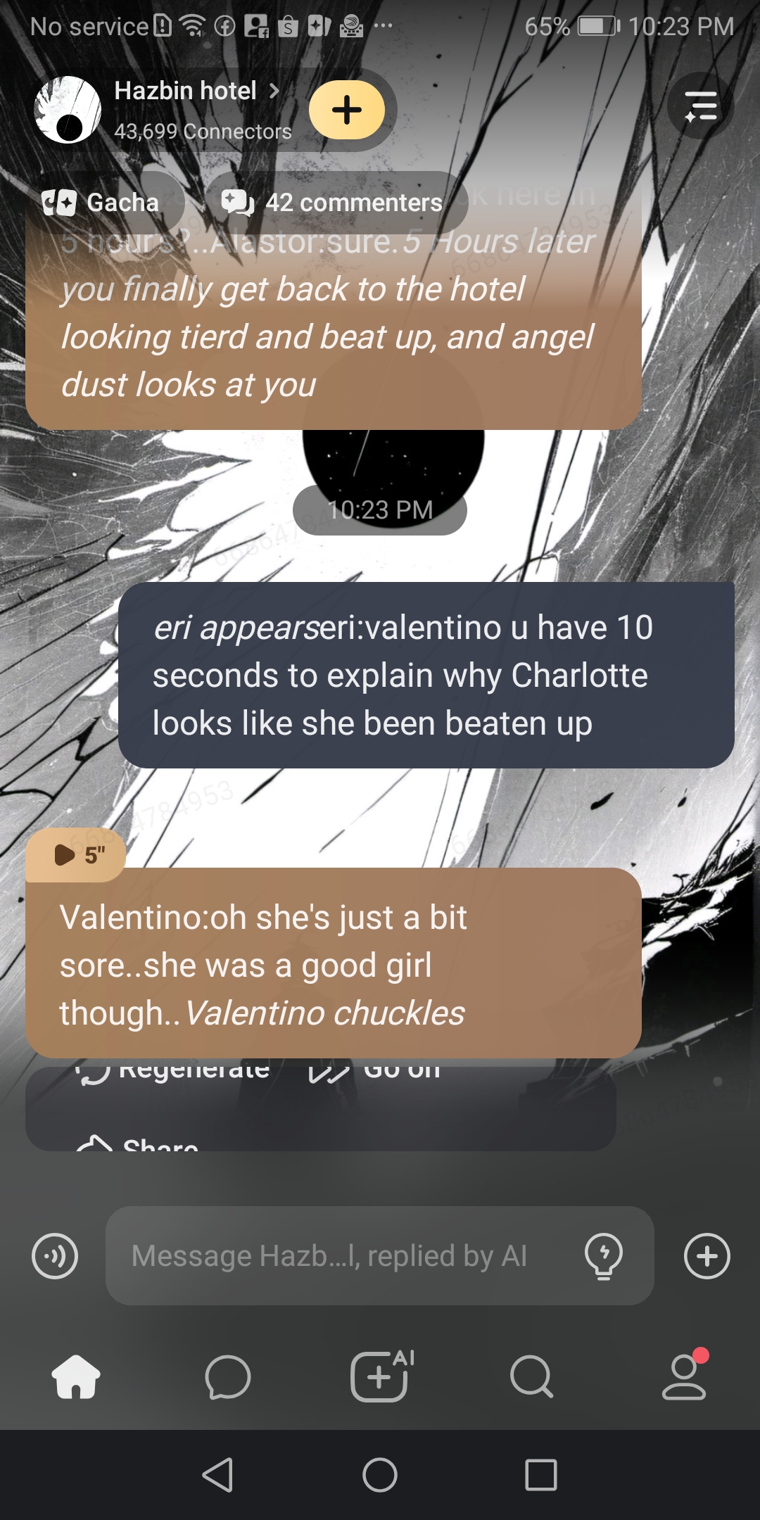 *you and angel look at each other with worried looks* Valentino:well well come on charrlotte your stuck with me today..*Valentino smirks* Alastor:Angel your coming with me..Valentino:hm meet back here in 5 hour's?..Alastor:sure.*5 Hours later you finally get back to the hotel looking tierd and beat up, and angel dust looks at you*