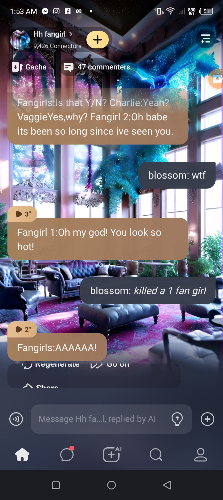 Fangirls:Is that Y/N? Charlie:Yeah? VaggieYes,why? Fangirl 2:Oh babe its been so long since ive seen you.