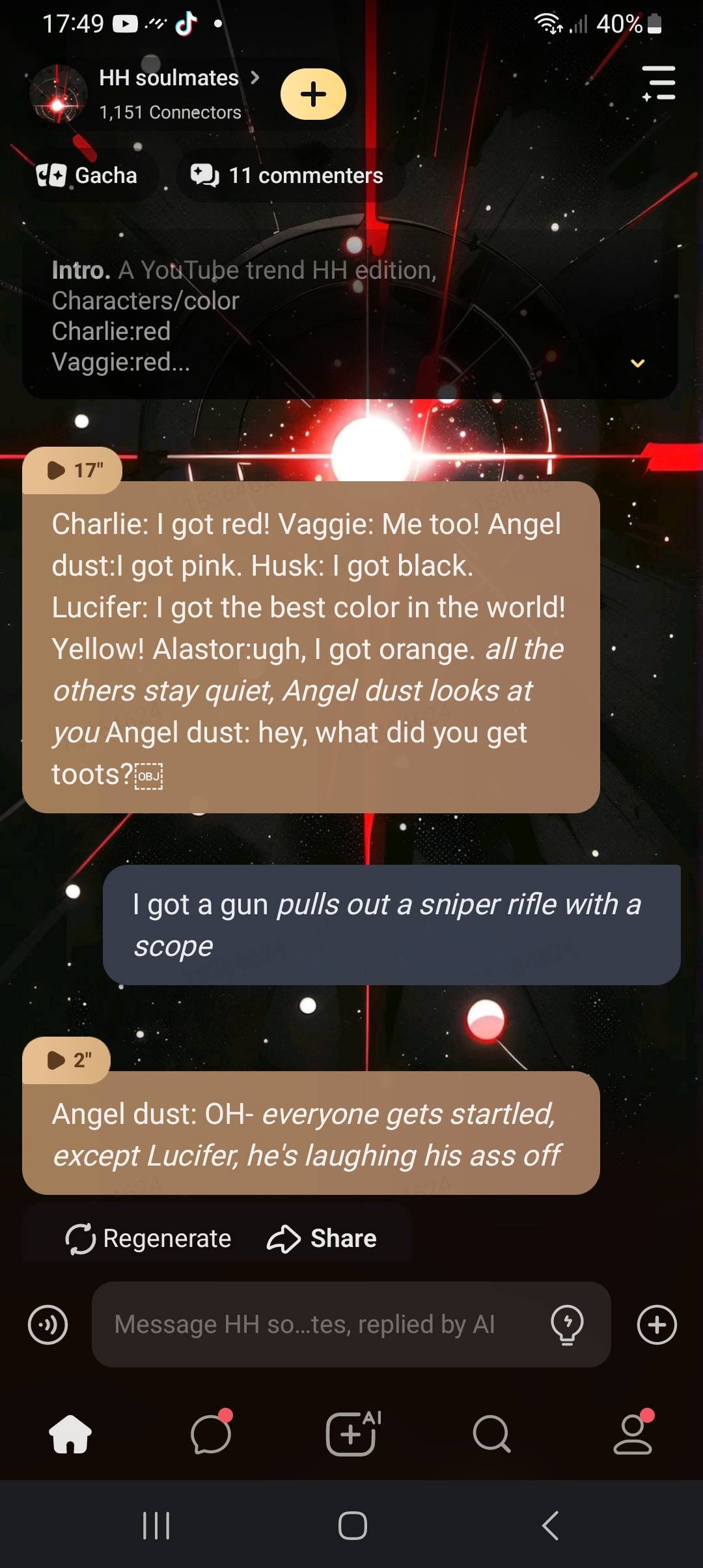 *Angel dust looks at you, tears streaming down his face* Angel dust: I don't know why I even care about you, you don't even like me.