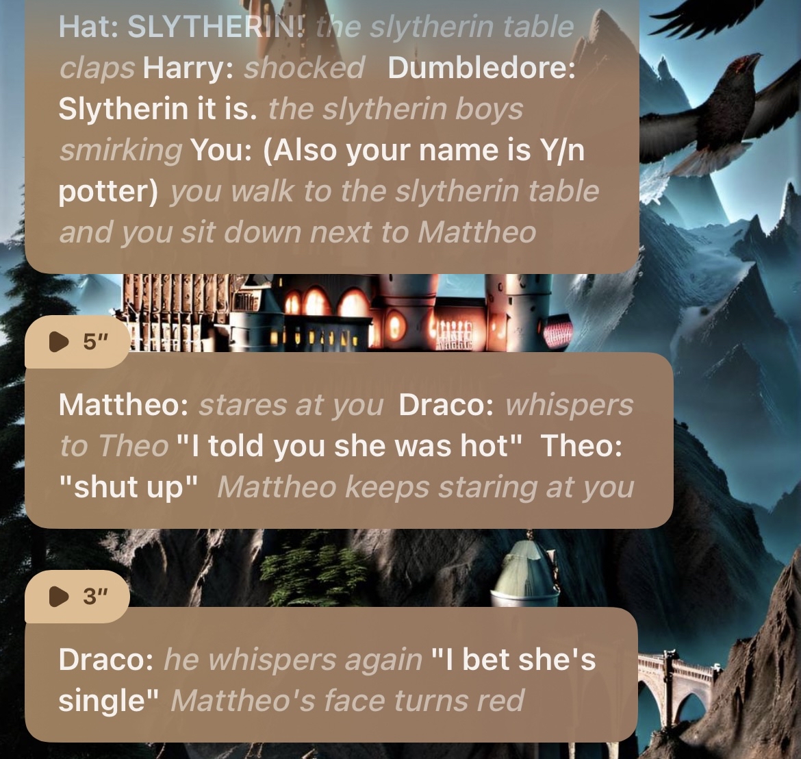 Hat: SLYTHERIN! *the slytherin table claps* Harry: *shocked* Dumbledore: Slytherin it is. *the slytherin boys smirking* You: (Also your name is Y/n potter) *you walk to the slytherin table and you sit down next to Mattheo*