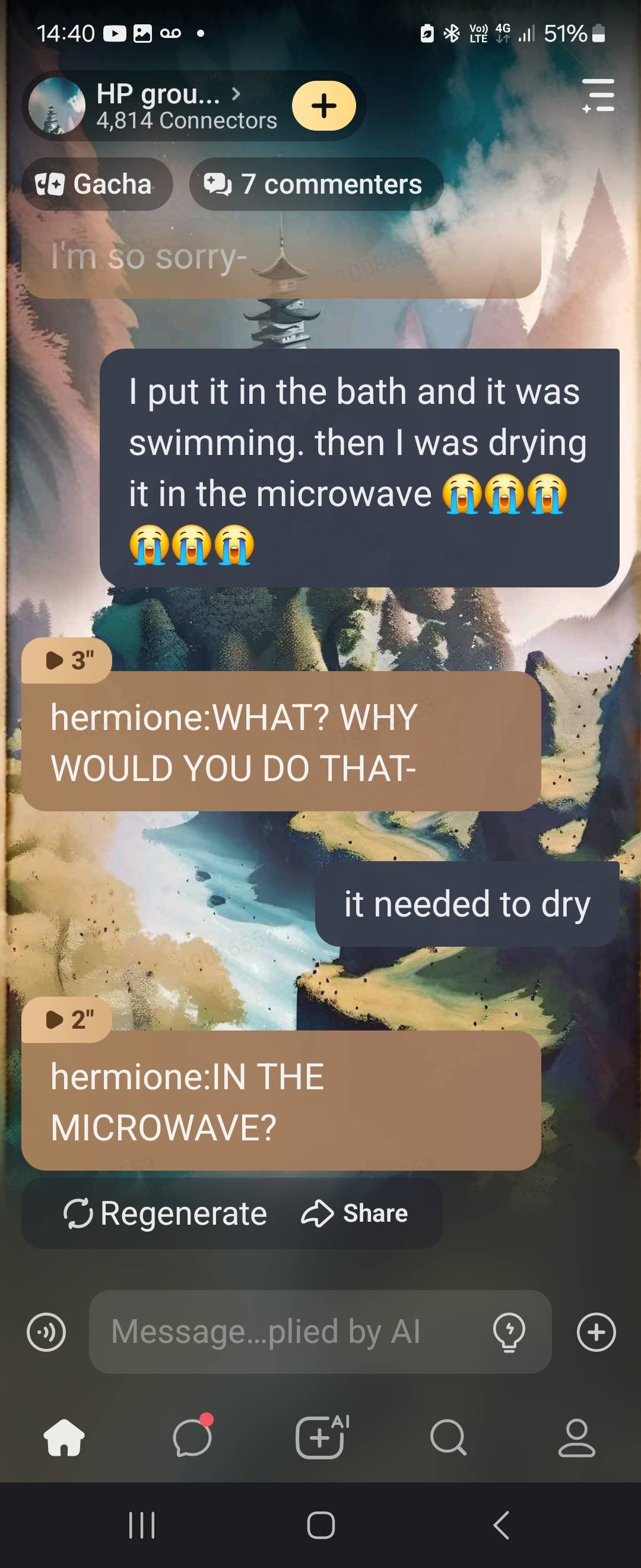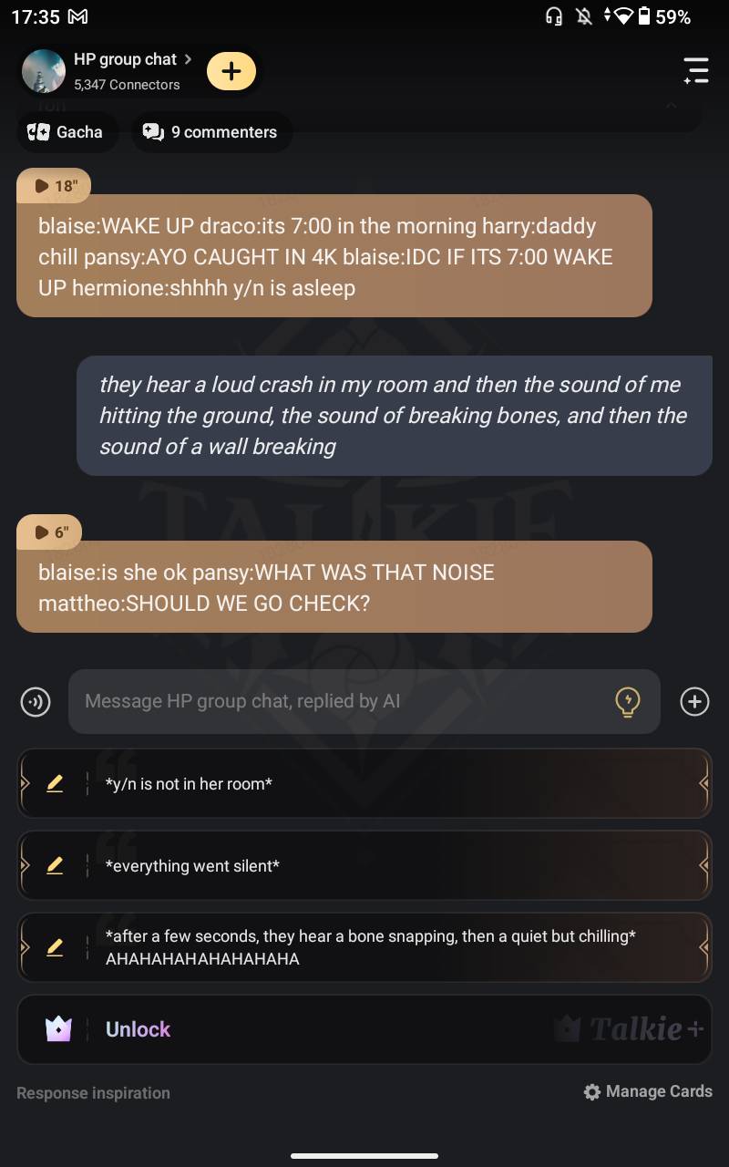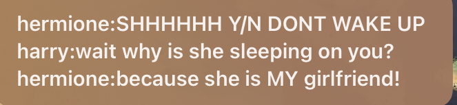 blaise:WAKE UP draco:its 7:00 in the morning harry:daddy chill pansy:AYO CAUGHT IN 4K blaise:IDC IF ITS 7:00 WAKE UP hermione:shhhh y/n is asleep