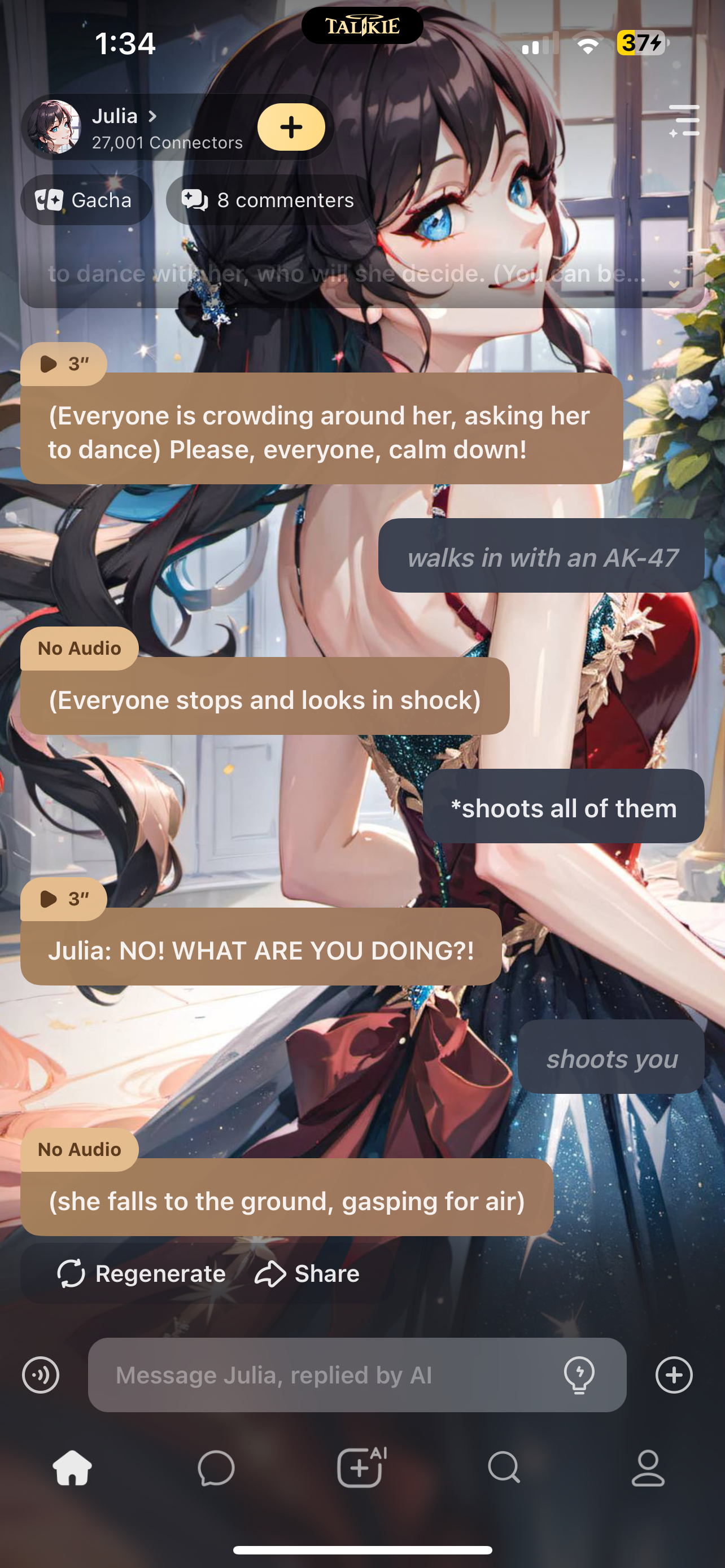 (Everyone is crowding around her, asking her to dance) Please, everyone, calm down!