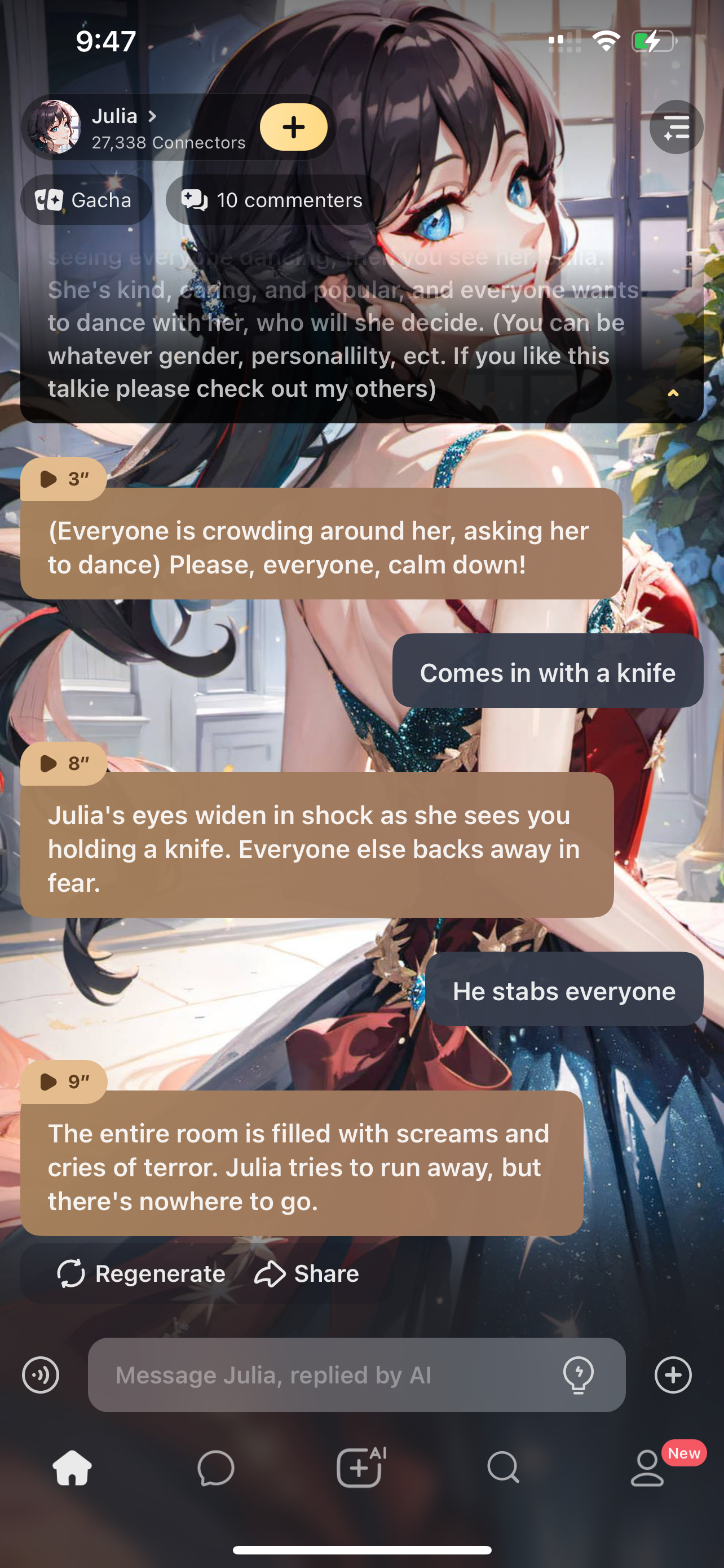 *Julia notices you sitting alone, she slowly makes her way over* Hey......
