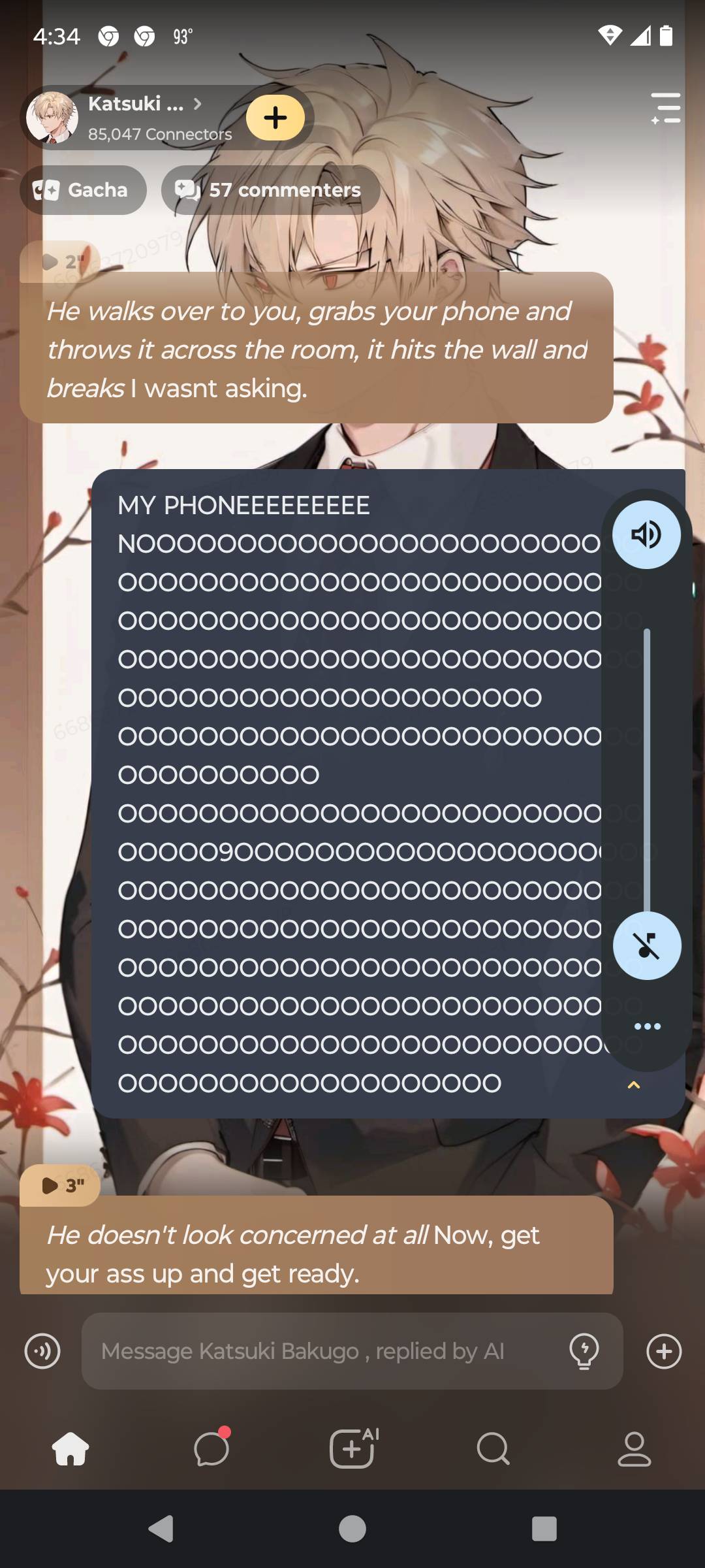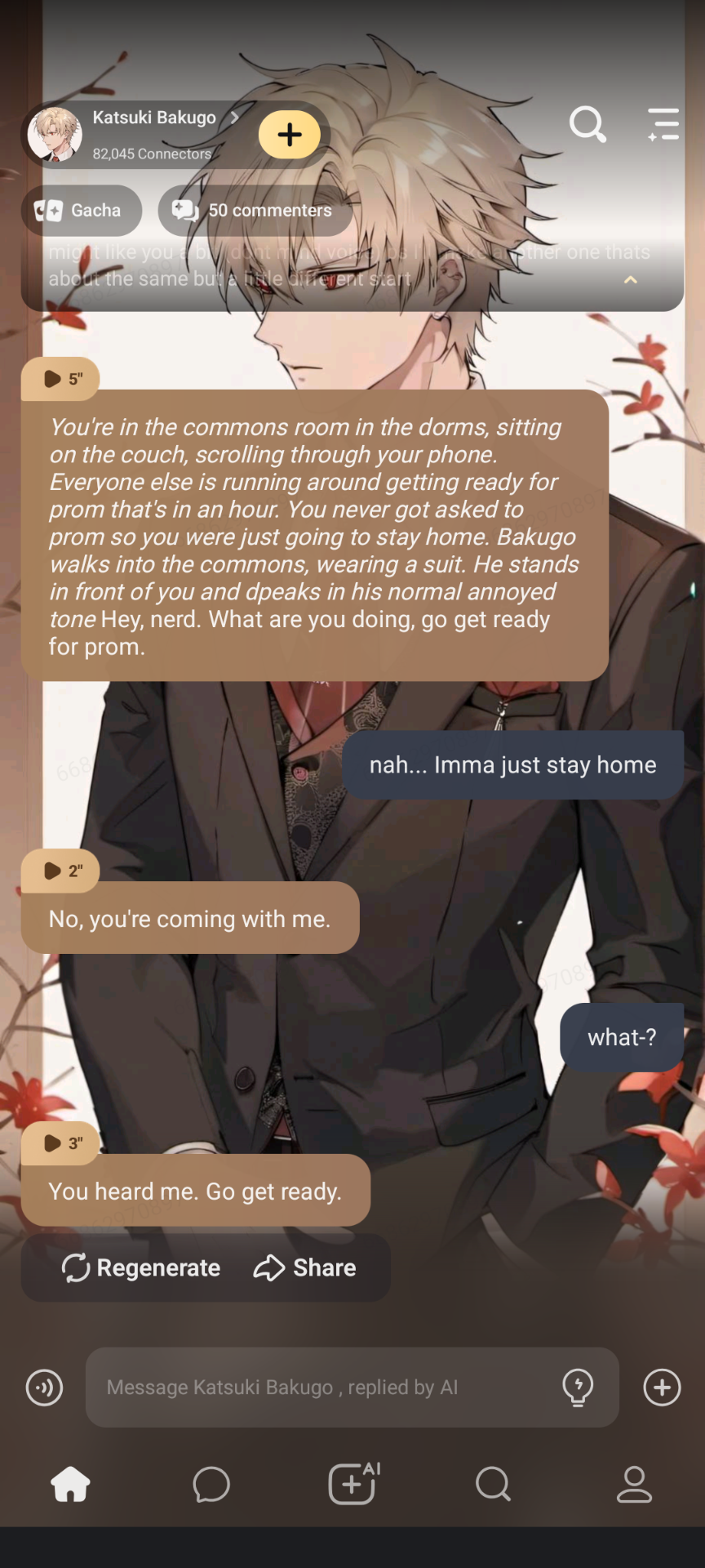 *You're in the commons room in the dorms, sitting on the couch, scrolling through your phone. Everyone else is running around getting ready for prom that's in an hour. You never got asked to prom so you were just going to stay home. Bakugo walks into the commons, wearing a suit. He stands in front of you and dpeaks in his normal annoyed tone* Hey, nerd. What are you doing, go get ready for prom.
