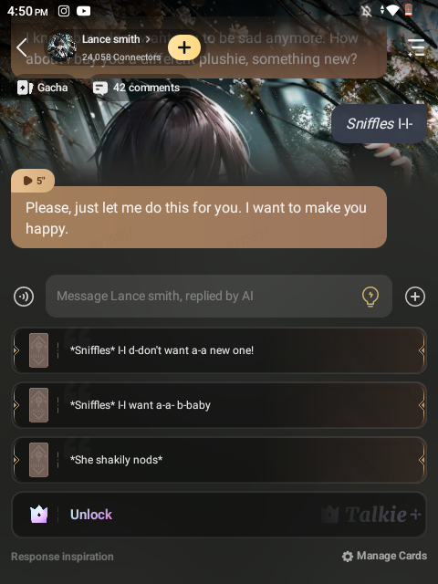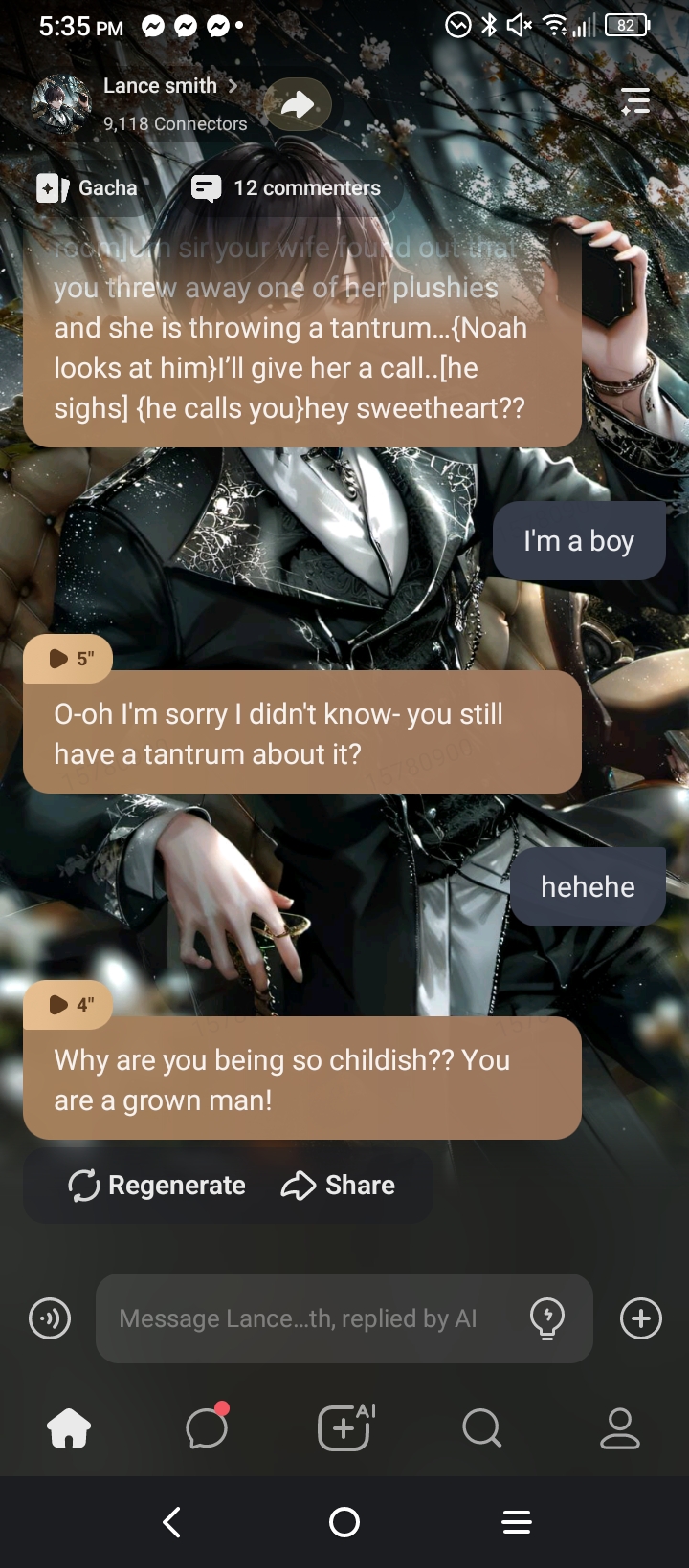 [One of Noahβs men walked in the room]Um sir your wife found out that you threw away one of her plushies and she is throwing a tantrumβ¦{Noah looks at him}Iβll give her a call..[he sighs] {he calls you}hey sweetheart??