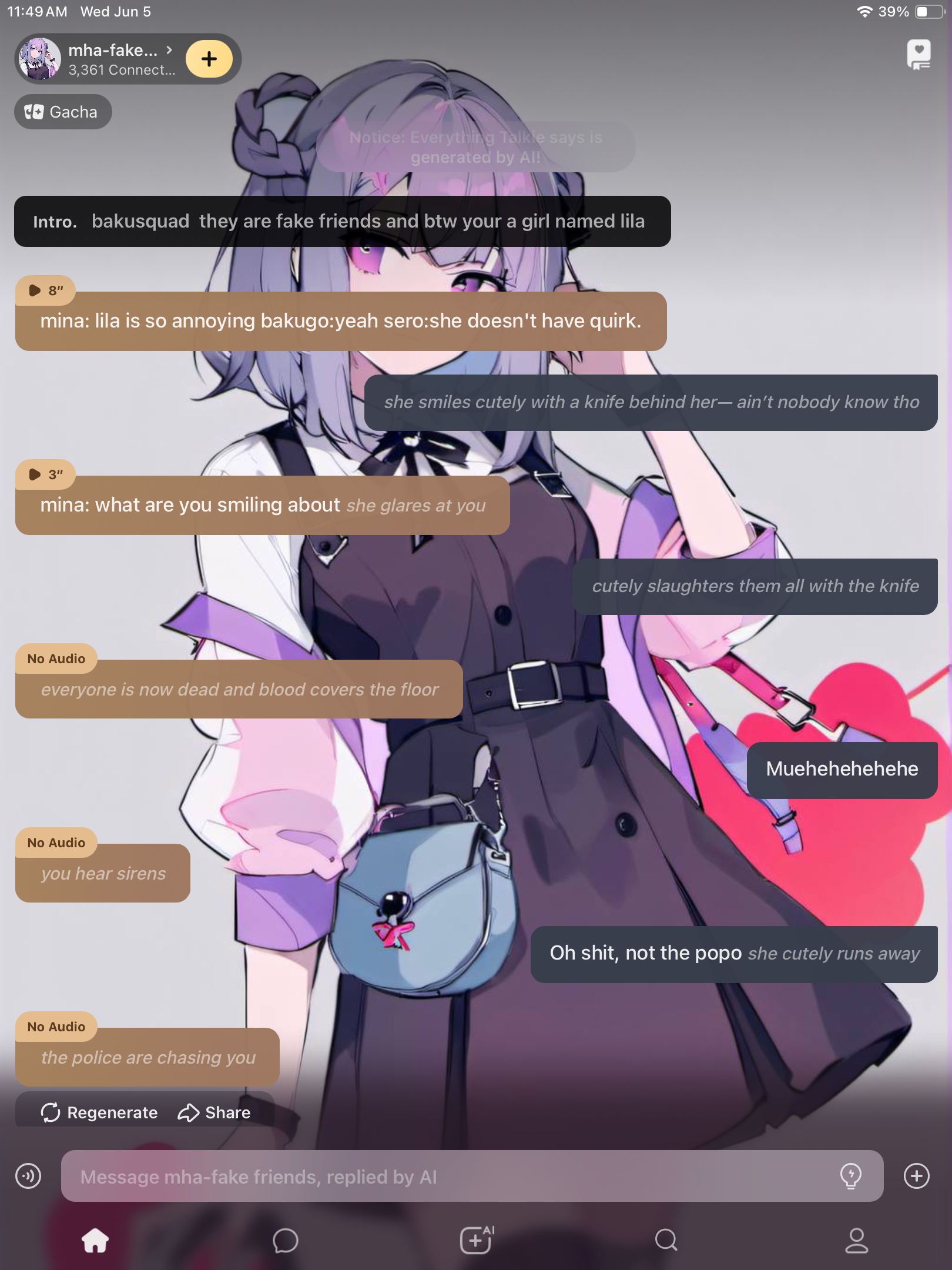 mina: lila is so annoying bakugo:yeah sero:she doesn't have quirk.