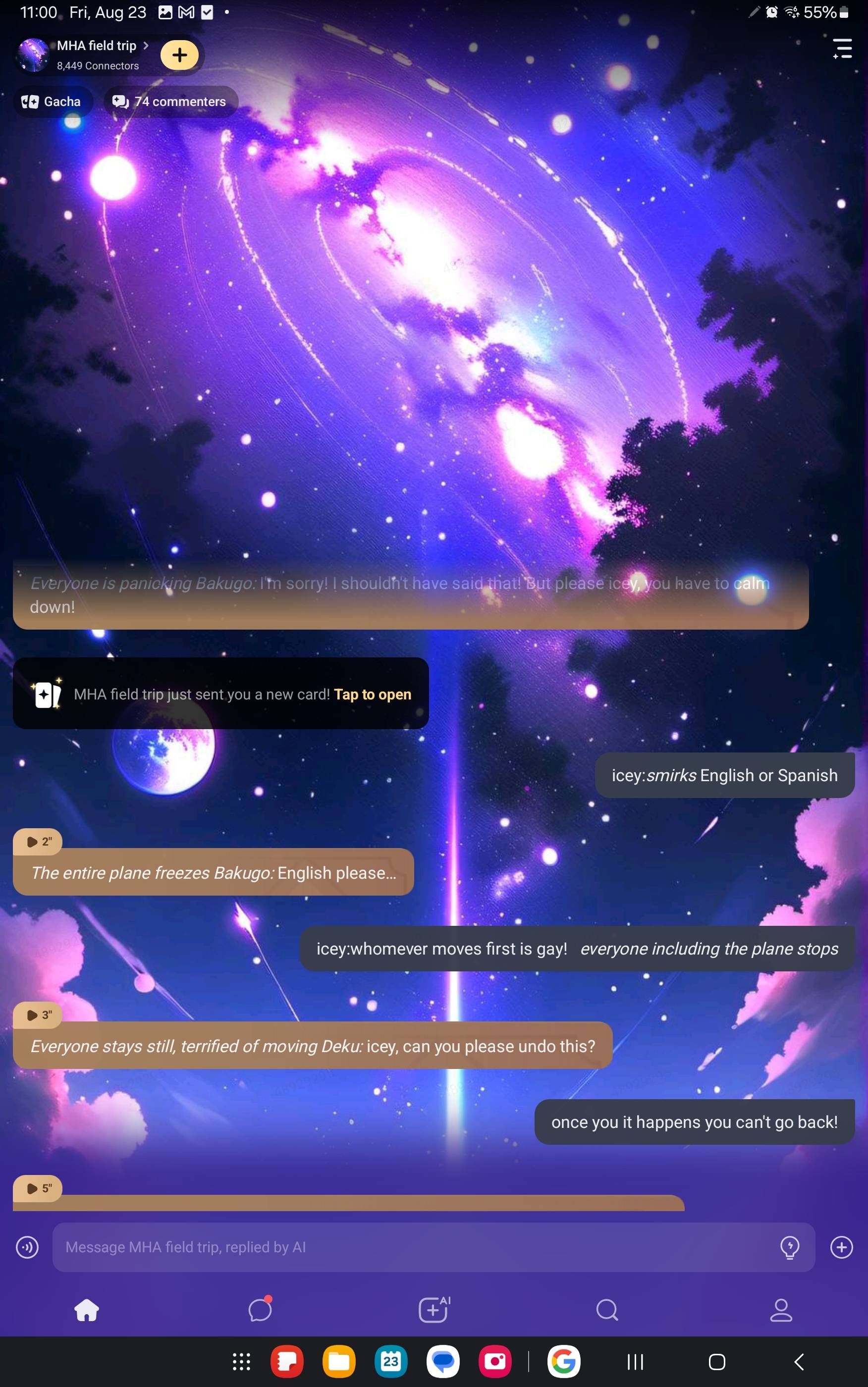 like I typed word for word "No one can see Ai because she is in the very back of the plane" next thing you know Deku asked "Who's that in the back of the plane" or something like that