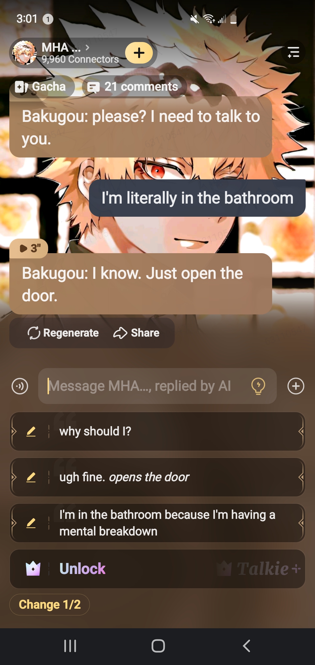 Bakugou: *he laughs a little* you were really out of it. I could have done anything to you and you wouldn't have noticed.