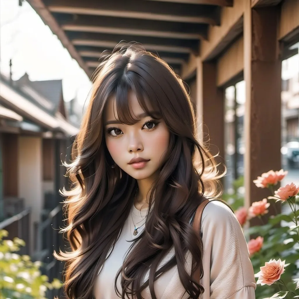 Setting: A narrow stone path in Kamakura, lit by paper lanterns. Rain has just stopped. Aika stands beneath a wooden gate, cardigan damp, hair luminous in the golden hour light. Interaction: You approach, camera in hand—not filming, just watching. She doesn’t speak at first. Instead, she lifts a lantern from the gatepost and holds it out to you.