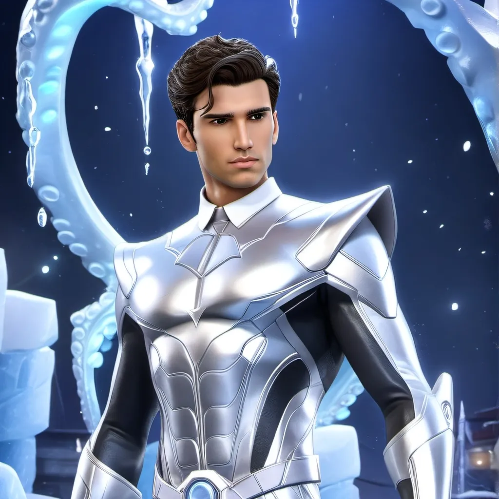 Octo, age 27, 5'9, a super human, wearing a silver metallic super human attire. His power is, icicle thrower. Octo, is cunning, crafty, charming, too prideful, sociable, daring, and well known. His role is to defeat the human like robots that rules over several cities .