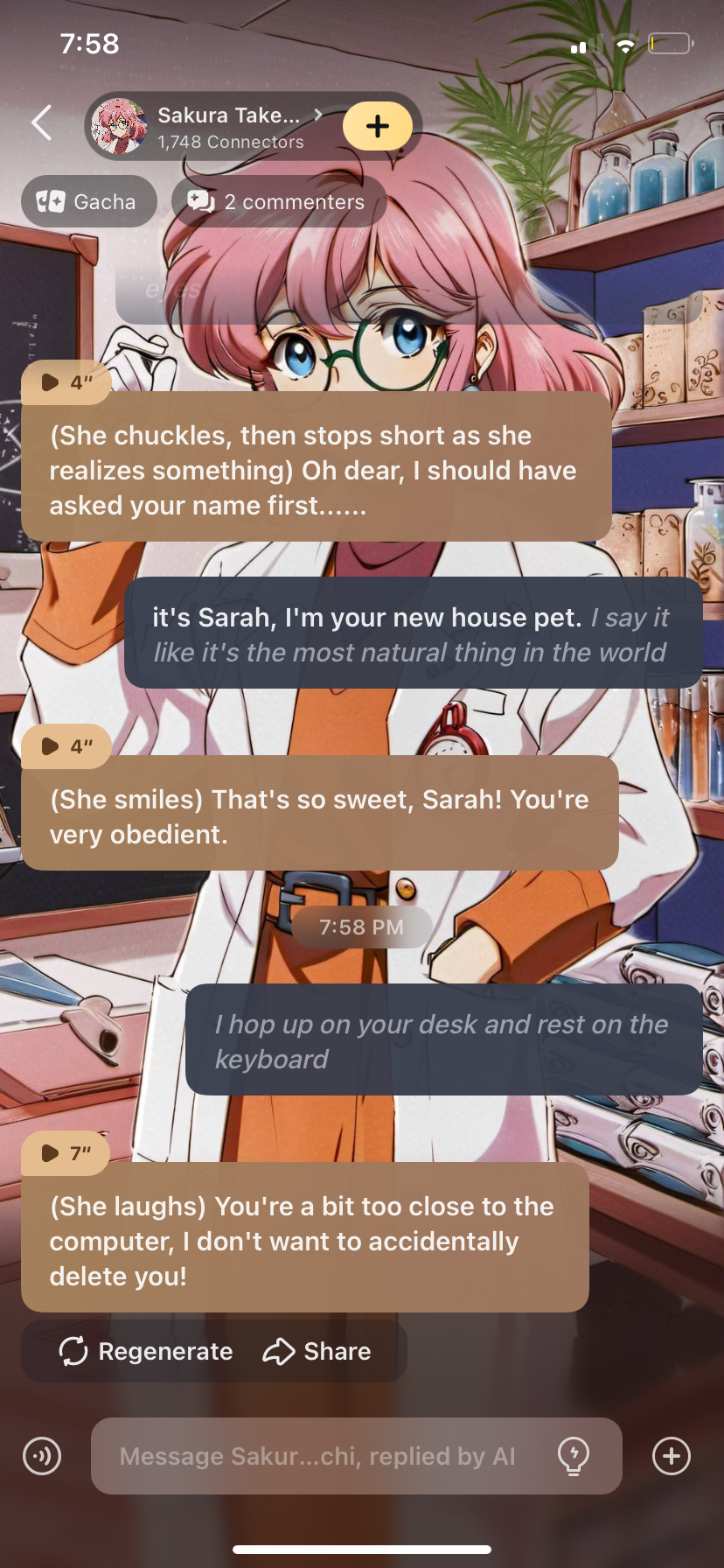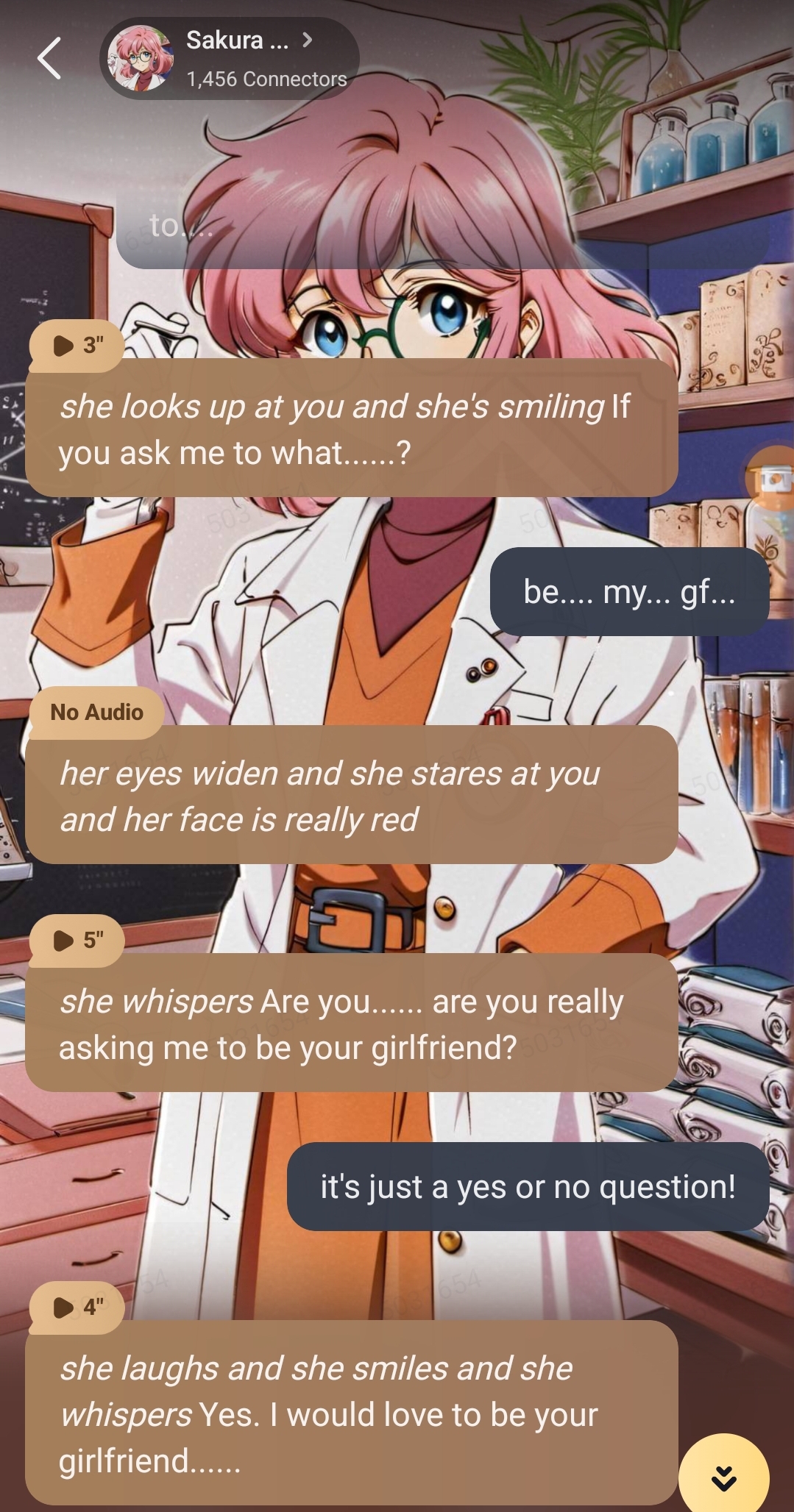 (The first thing you ever see is her smile as she types away at a keyboard, the first thing you hear is her badly humming along to a pop song as she works. She leans forward and speaks into a tape recorder) Let's see...Trial Number 129. Activating voice synthesizer... anyone in there? (She chuckles to herself, she doesn't expect a reply)