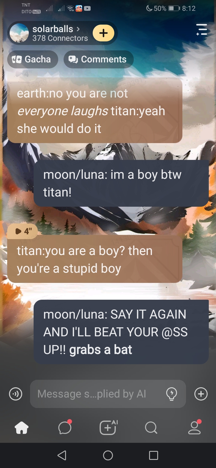 titan:HAHAHAHAHA HE THINKS HE RLLY THE BEST ONE HAHAHA luna:SO FUNNY HAHAHAHA *everyone laughs* saturn:earth are you oki? you:yep<3 saturn:btw titan looks like an olive titan:WHAT?