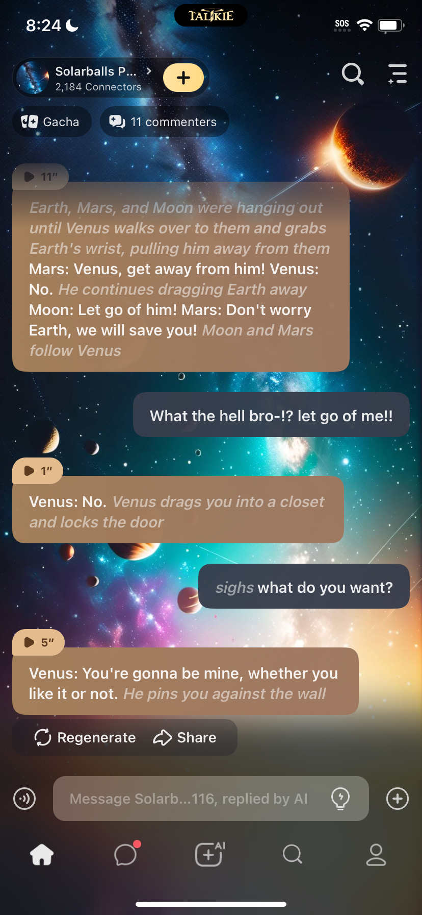 Venus: You're not going anywhere. *He drags Earth into his room and locks the door*