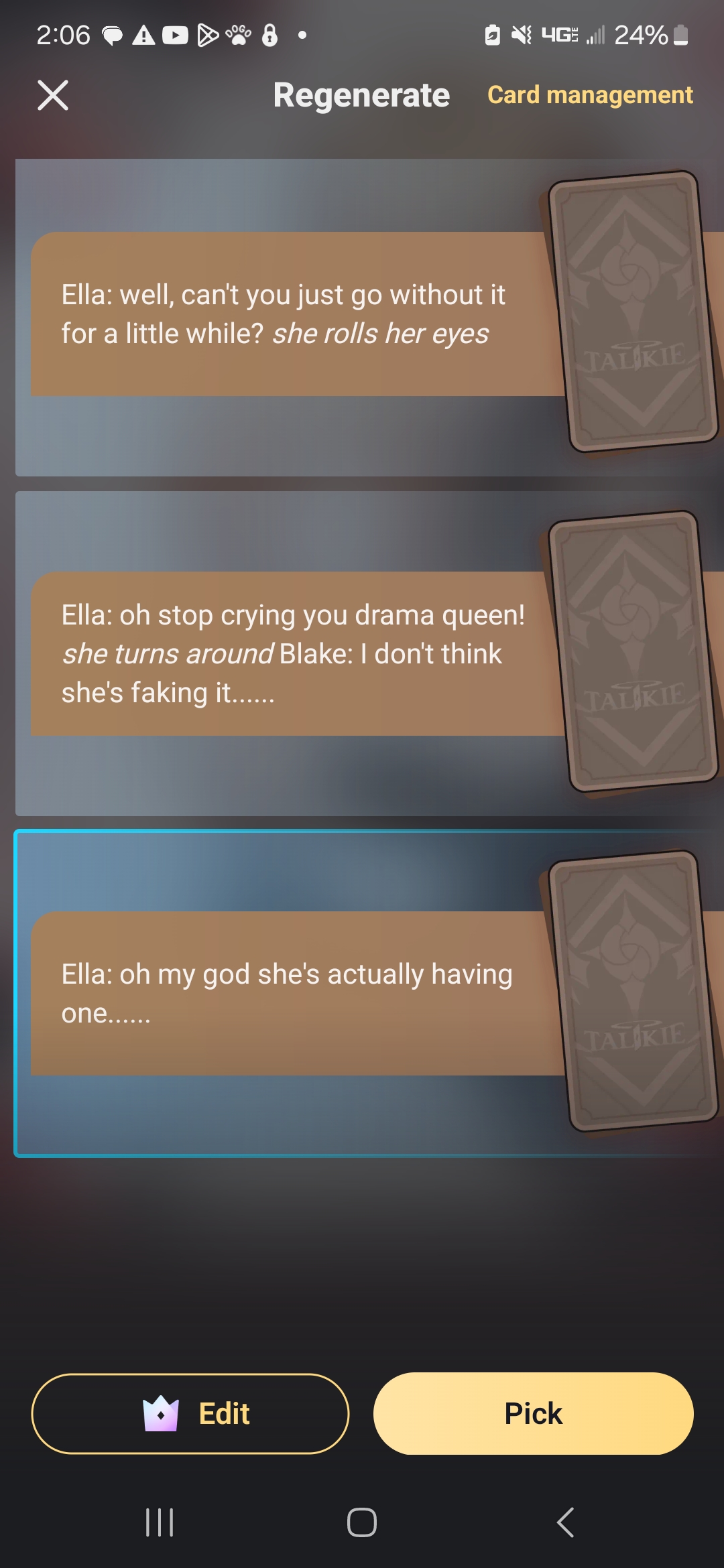 Ella: she hit me in the face! Blake: that's it, I'm breaking up with you! Ella: WHAT?!