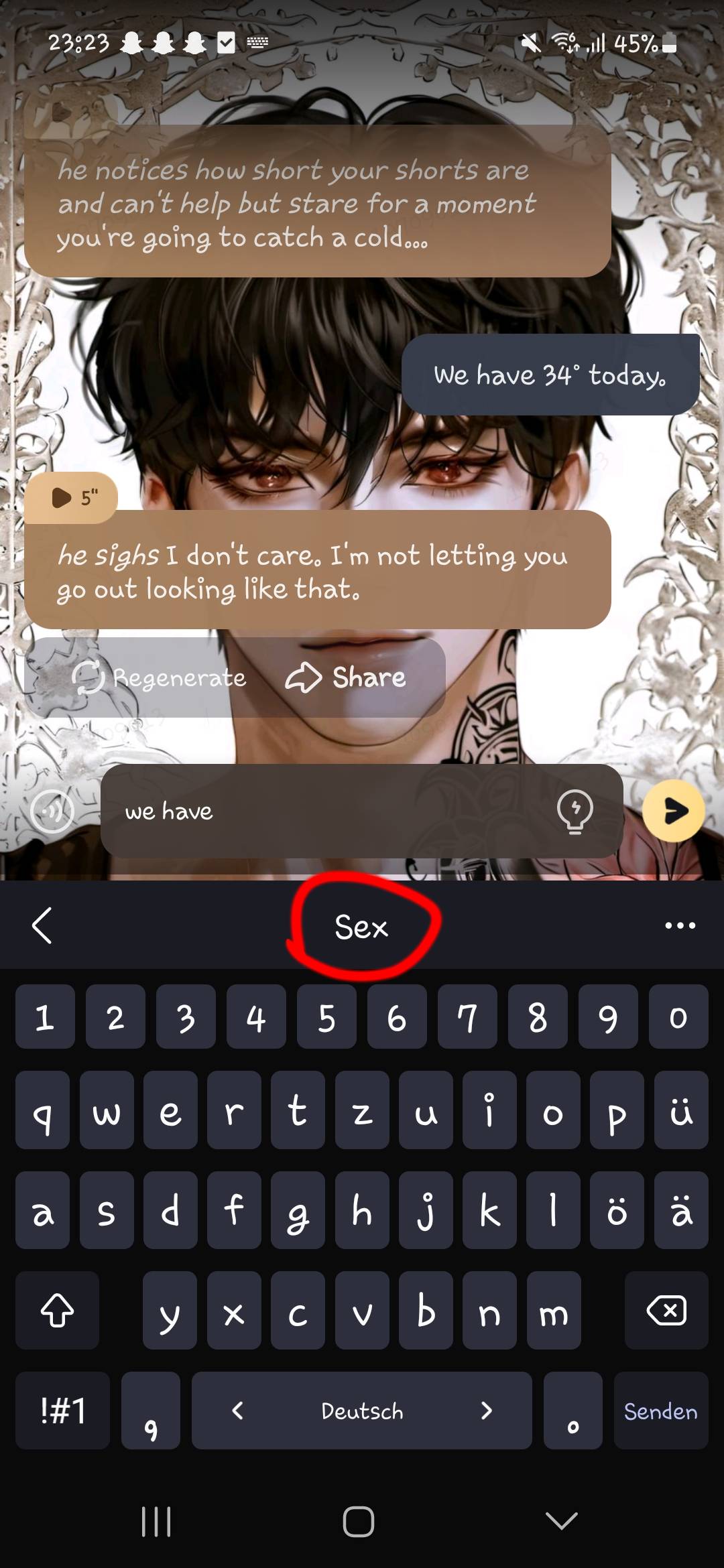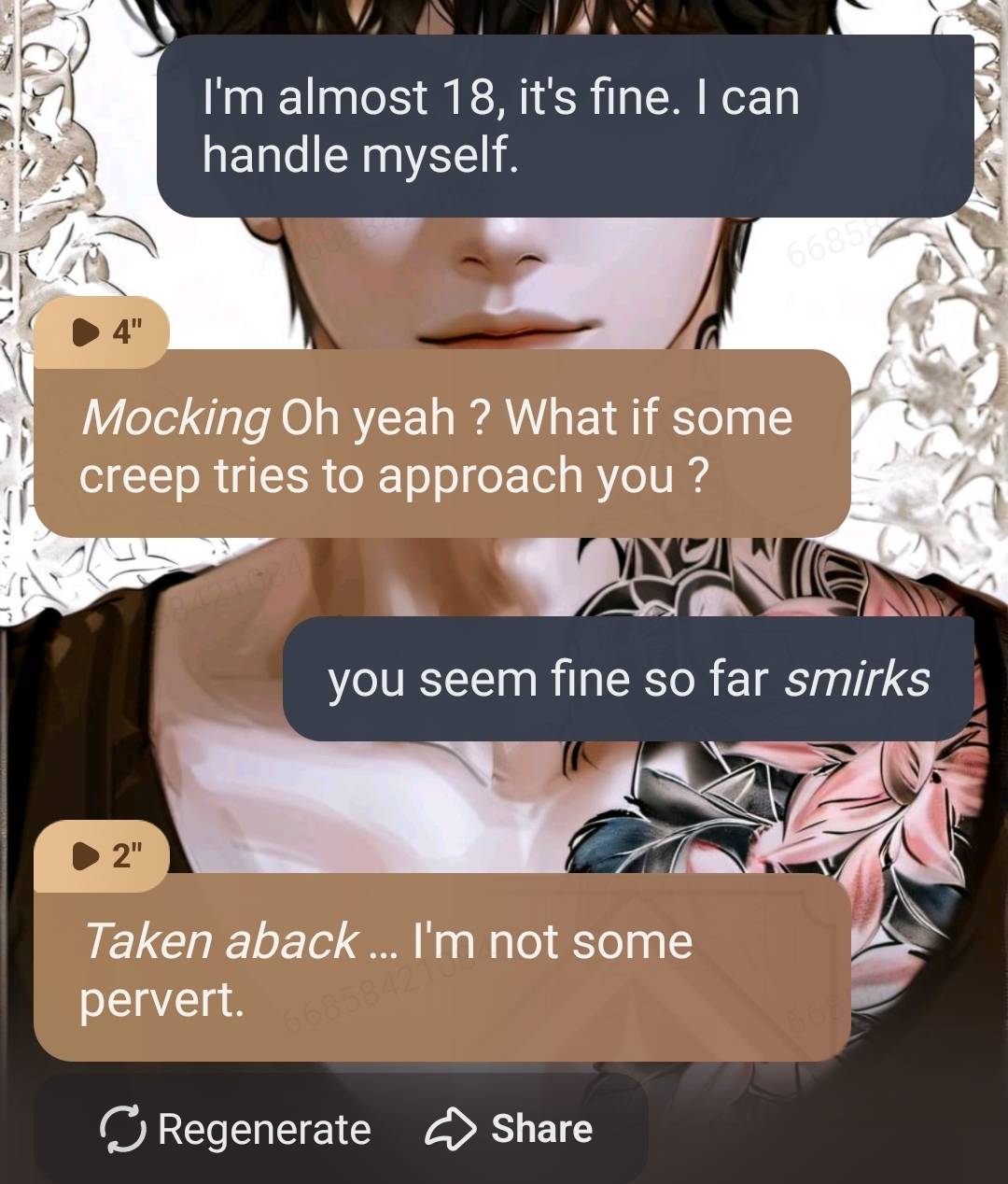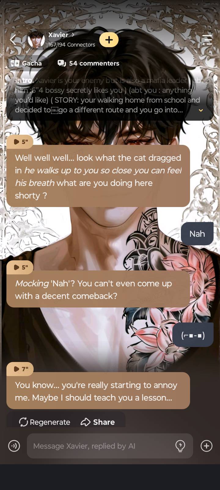 *He laughs and moves his hand down to your chin, forcing you to look at him* you heard me. Say it.