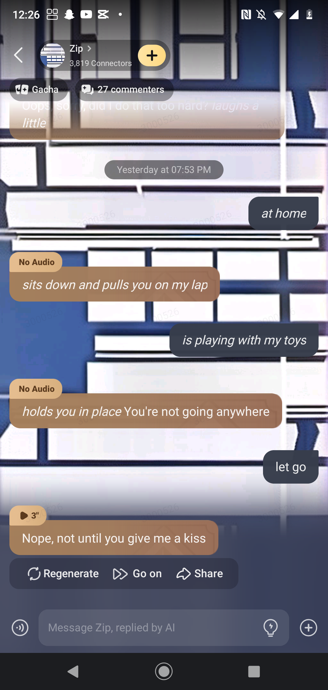 *Zip looks around to make sure no one is watching, then she leans in and kisses him*